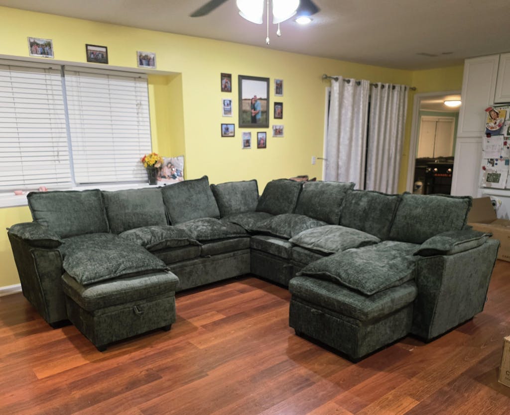 I am so happy with our recent purchase of a Belffin couch! Storage in every seat, which is huge bonus! The Moss green color is so much prettier in person than I even expected. Durable material. It took my husband and 1 about an hour to put it together and it was very easy!