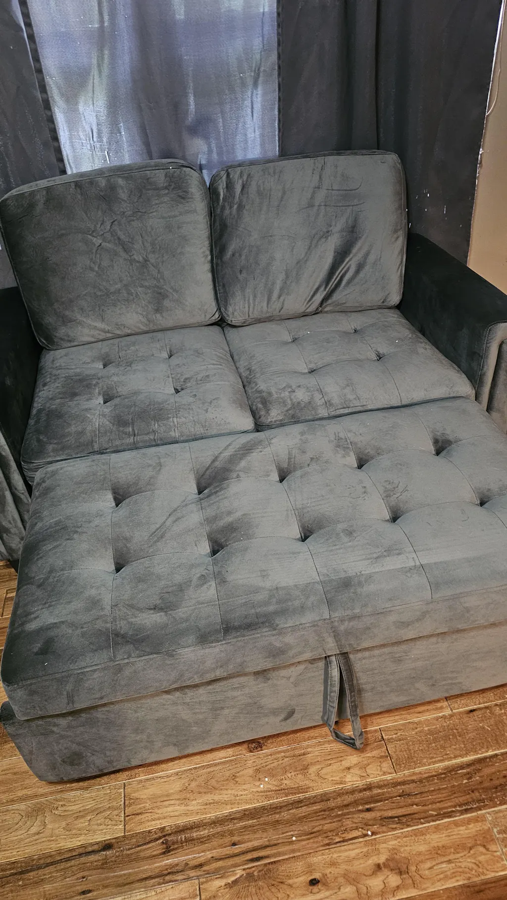 The color is to die for, such a beautiful deep blue. The cushions are firm but not rock hard. Assembly was so simple, my daughter helped and it was together in no time. The pull out part is just fun and comfortable for our nightly tv time, easy to pull out and push back in. It's the perfect size for my tiny living room but still big enough so the kids aren't fighting for space.