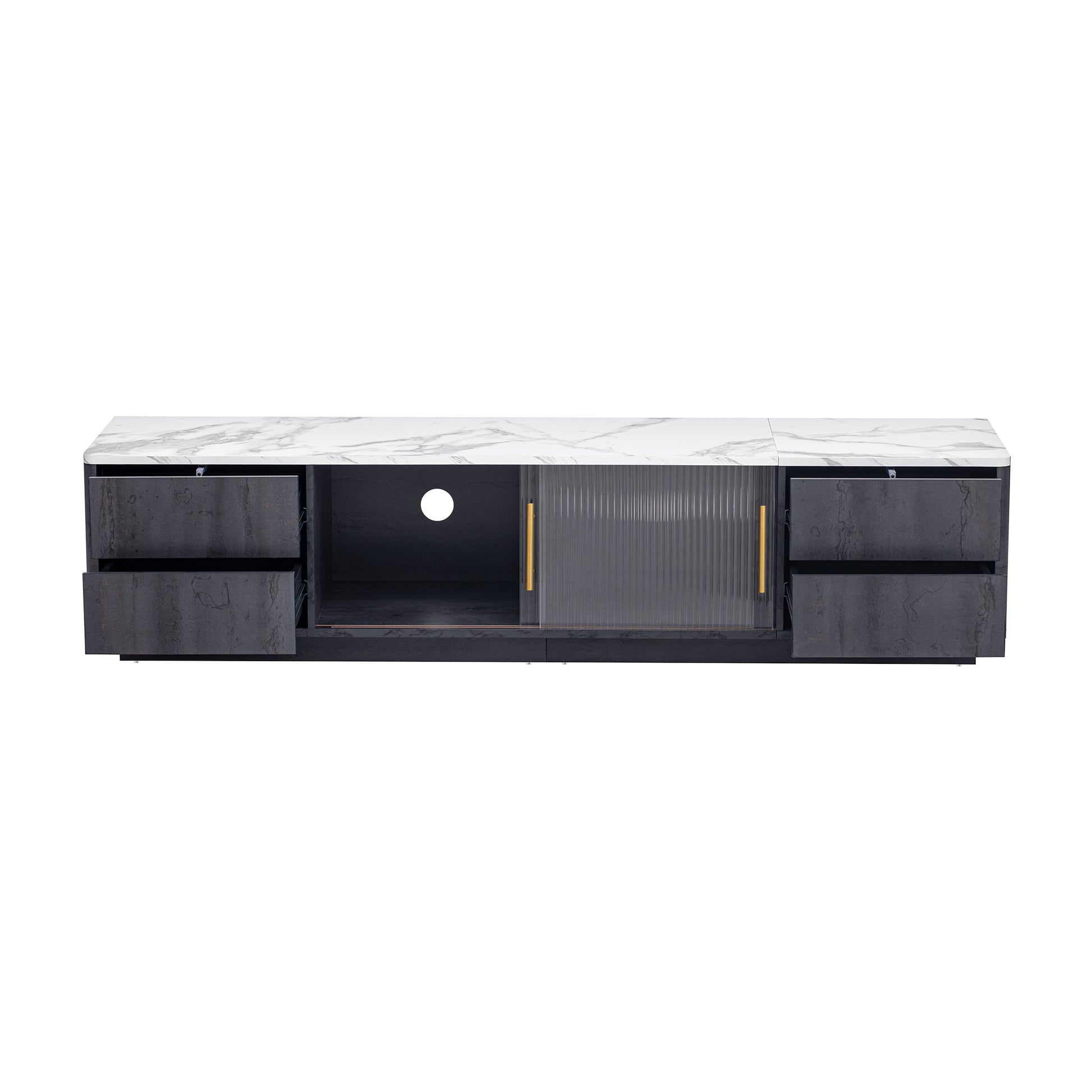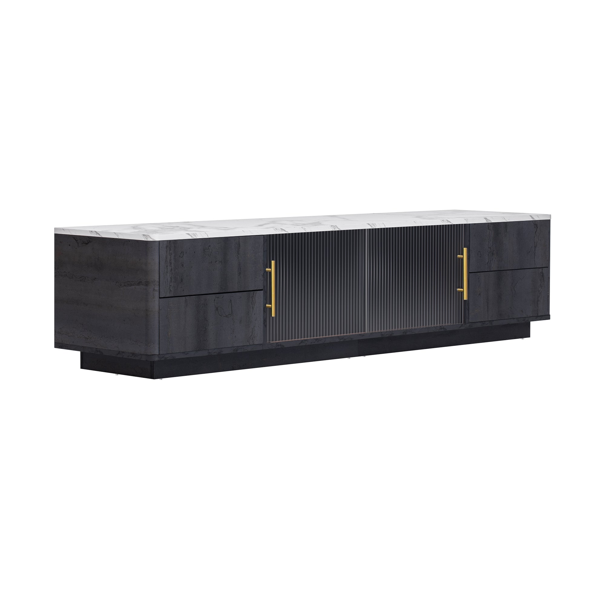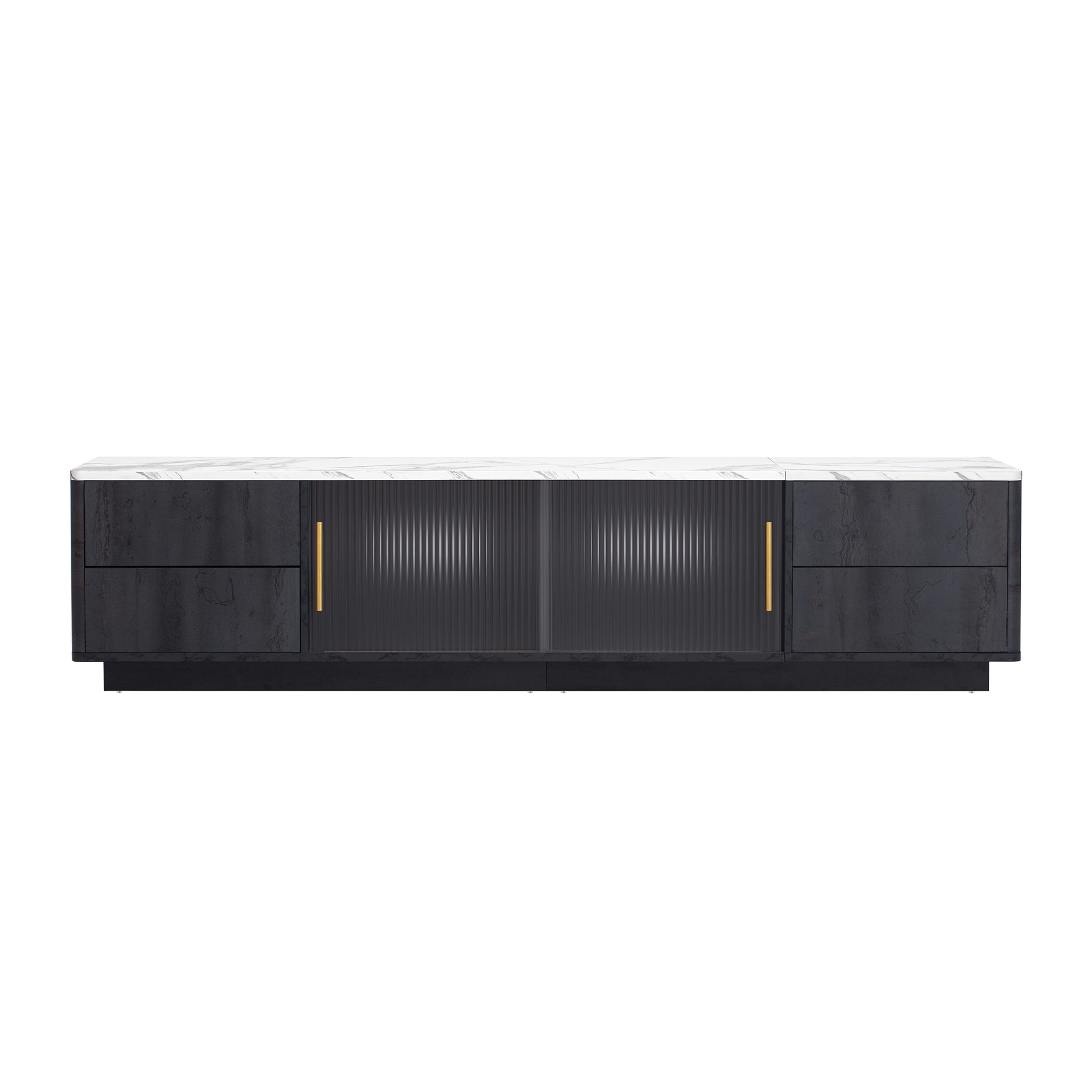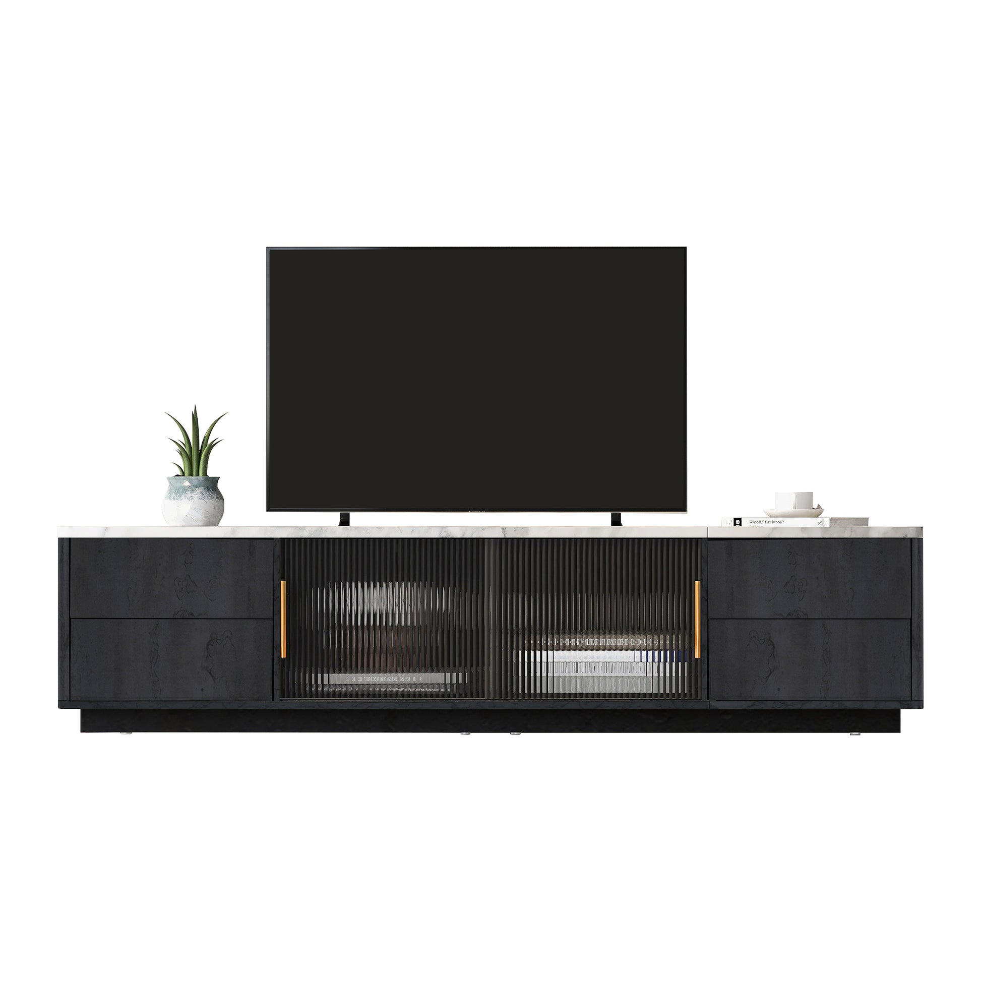 Sleek and sophisticated, this TV stand features a black wood finish, a marble top, and fluted glass doors for a modern touch. Gold-accented handles add elegance, while spacious storage keeps your space organized.