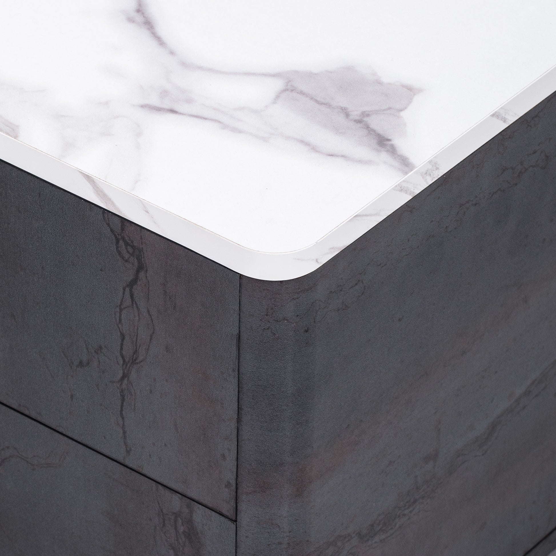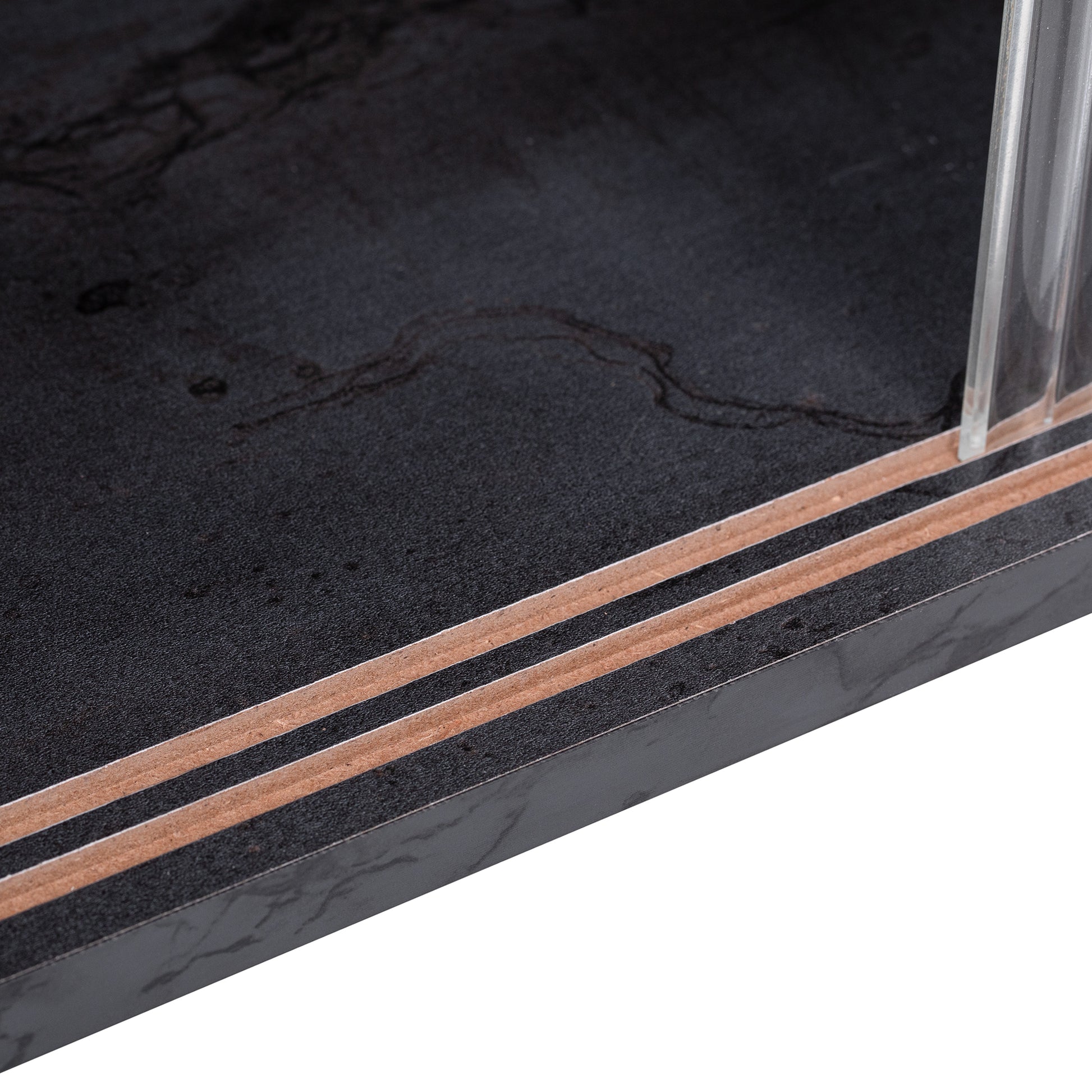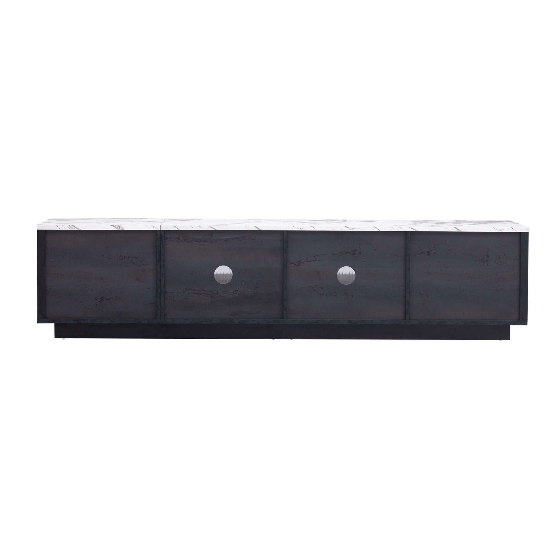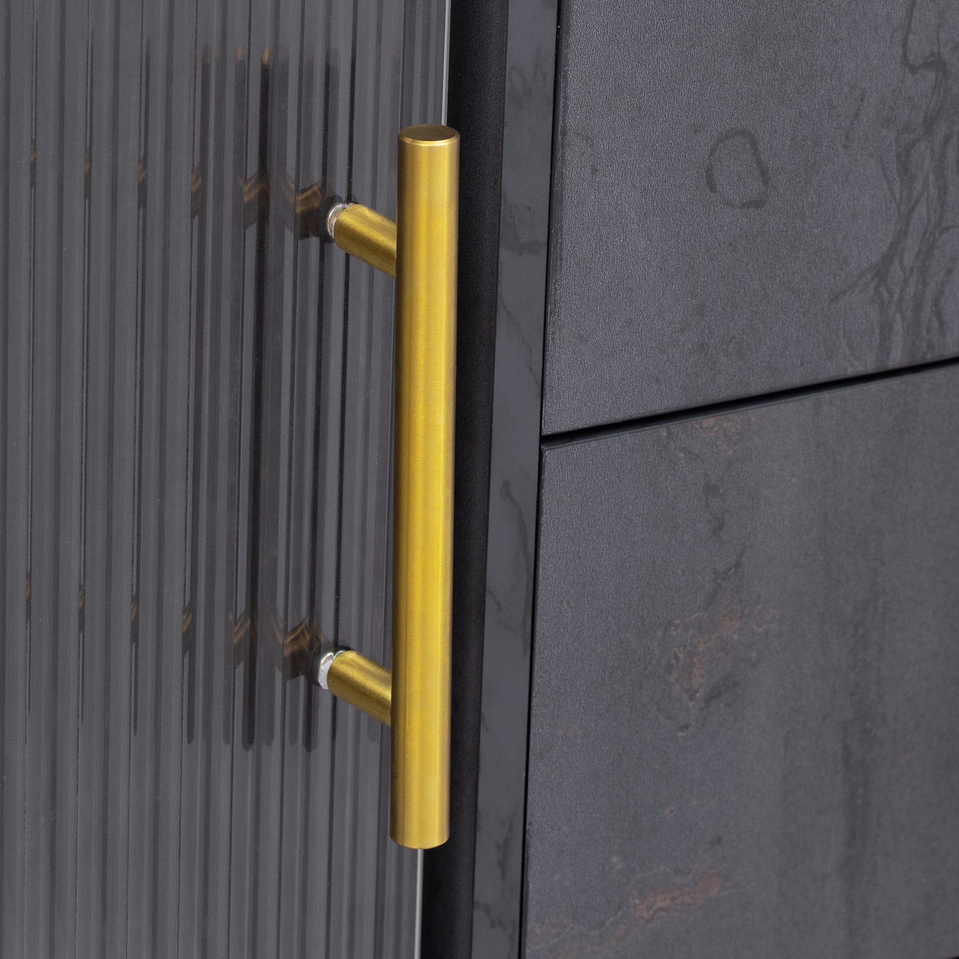 Sleek and sophisticated, this TV stand features a black wood finish, a marble top, and fluted glass doors for a modern touch. Gold-accented handles add elegance, while spacious storage keeps your space organized.