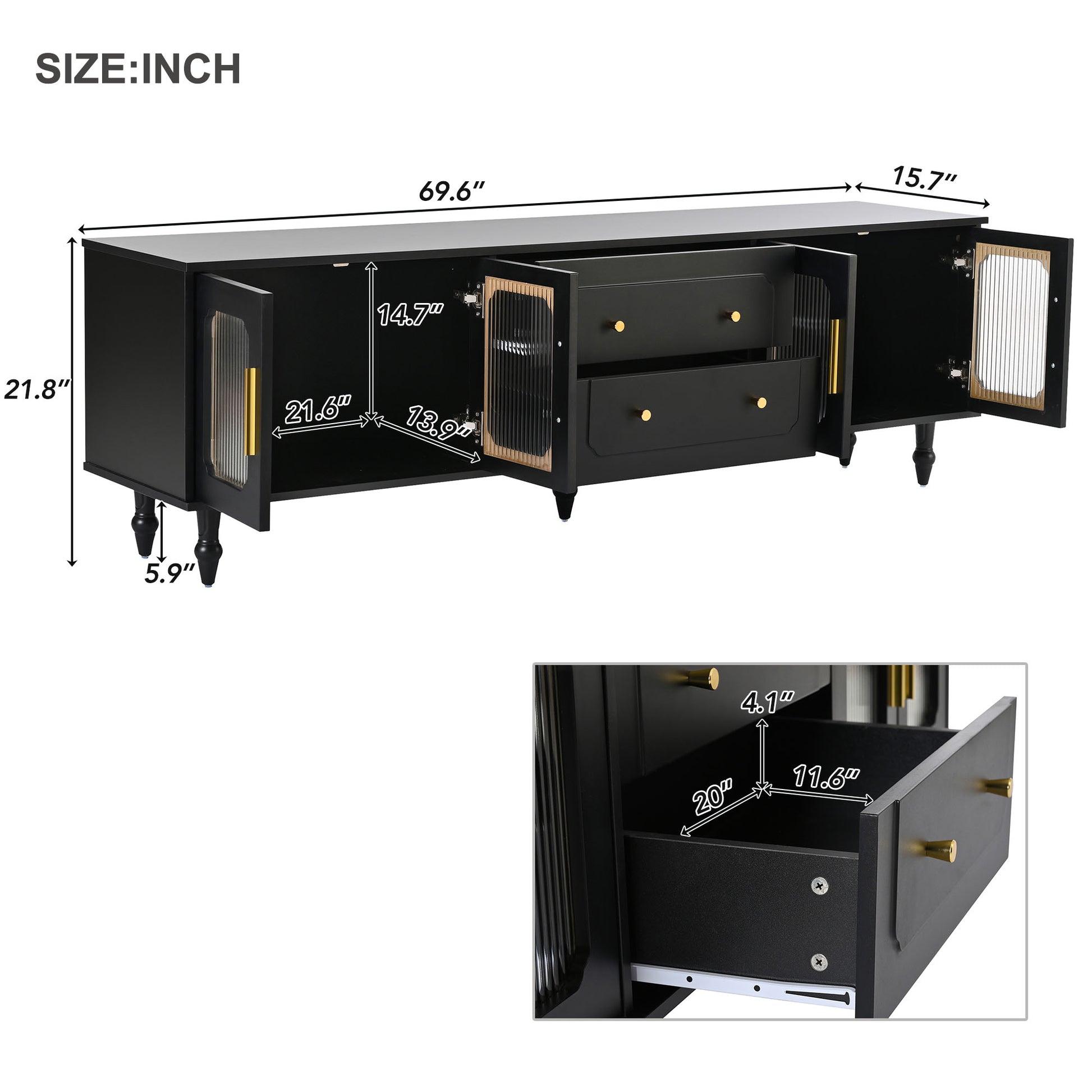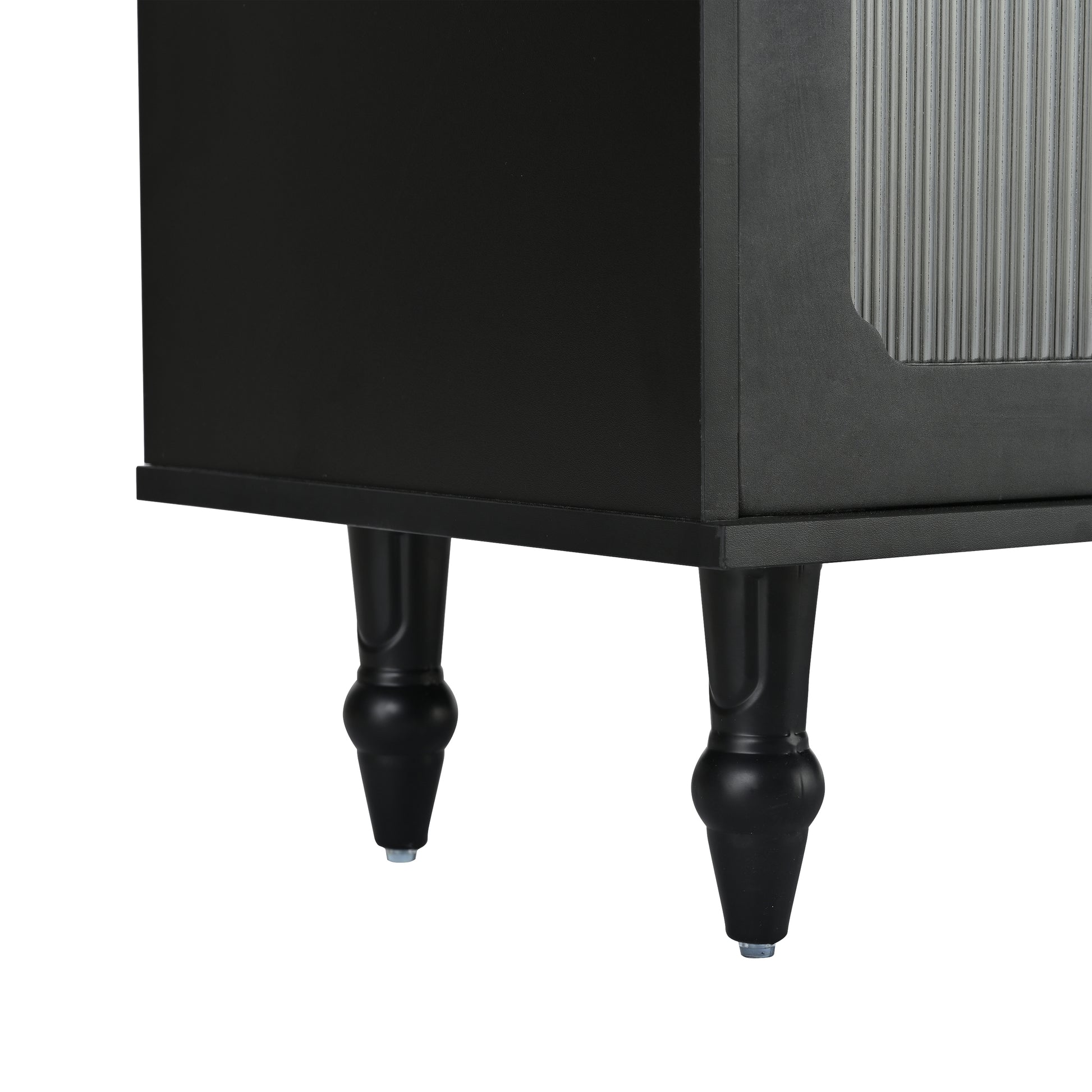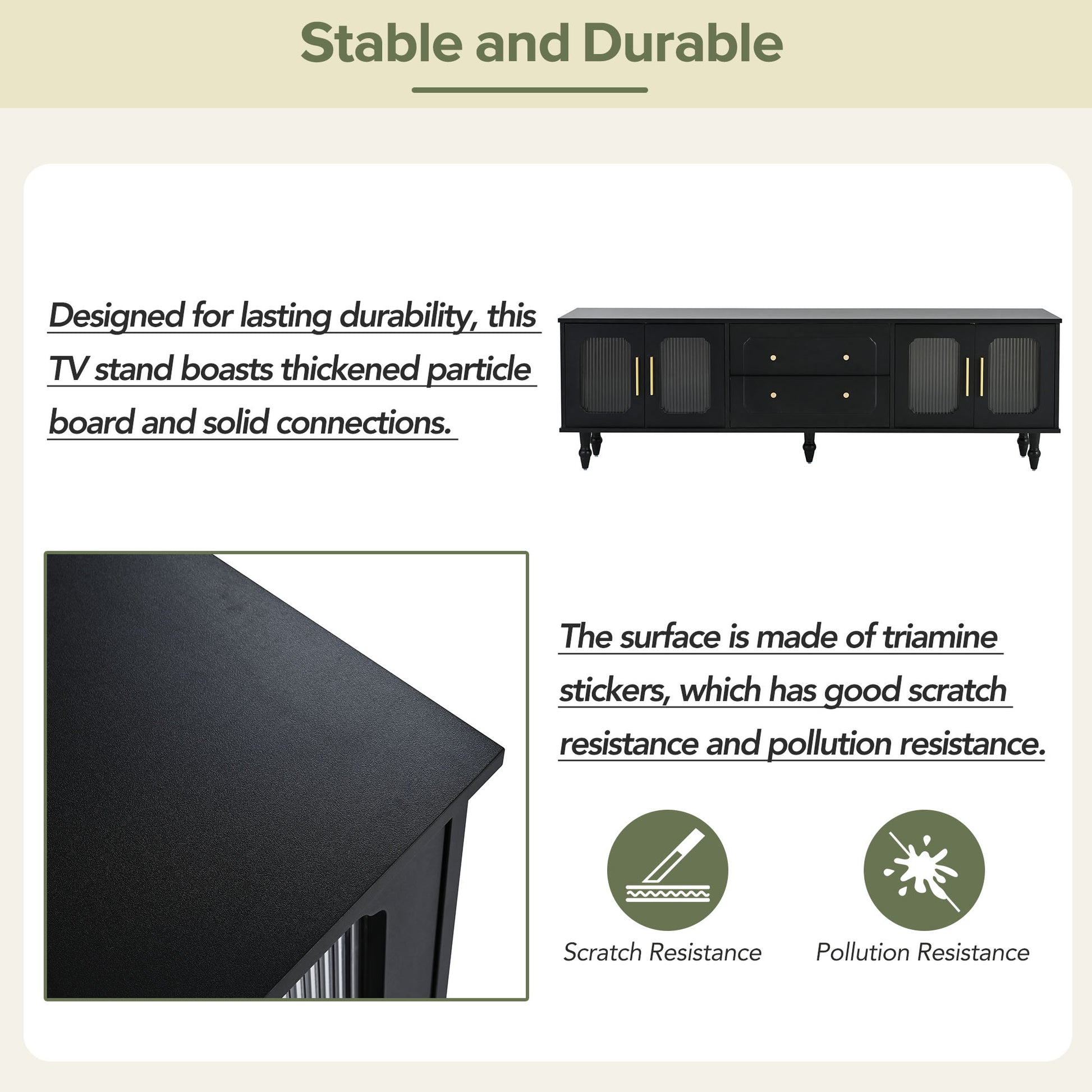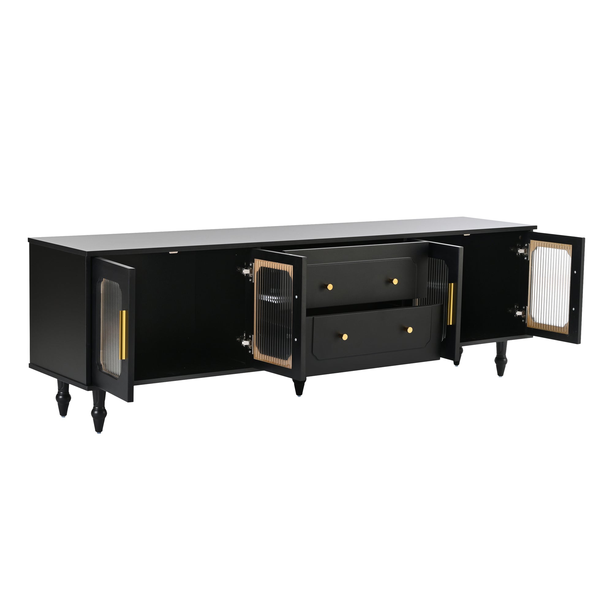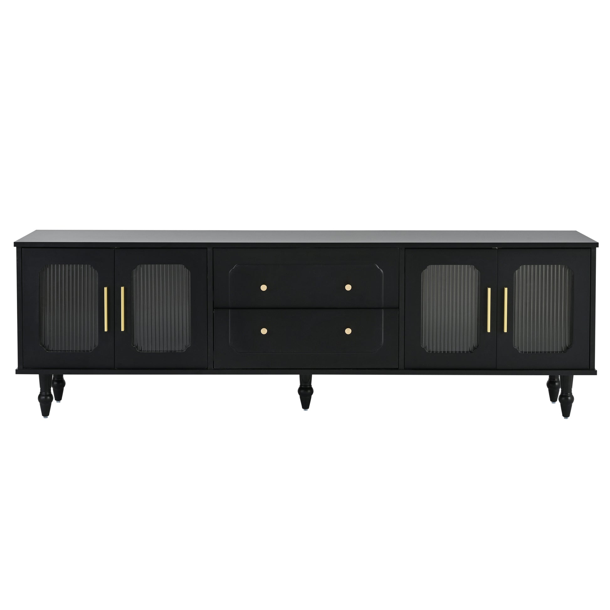 This TV stand boasts a sleek and exquisite appearance aesthetic, featuring crafted fluted glass doors and unique gourd-shaped table legs. This kind of door allows natural light to filter through, and can help to enhance spatial openness.