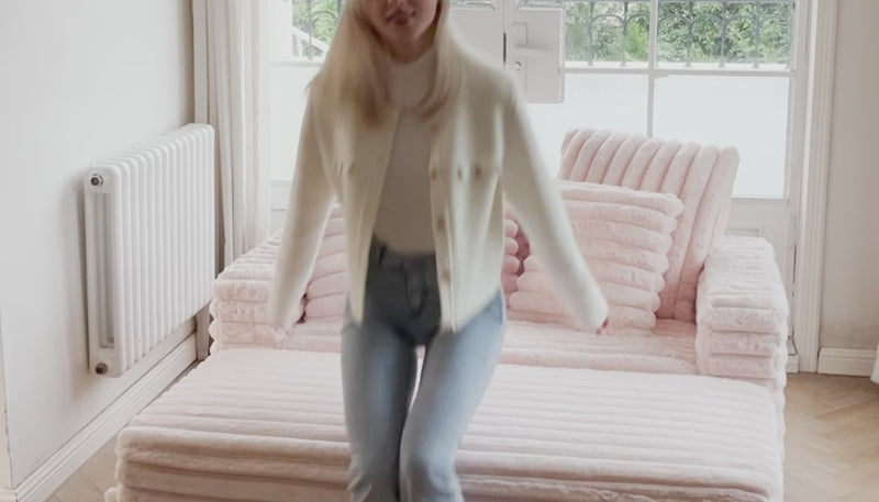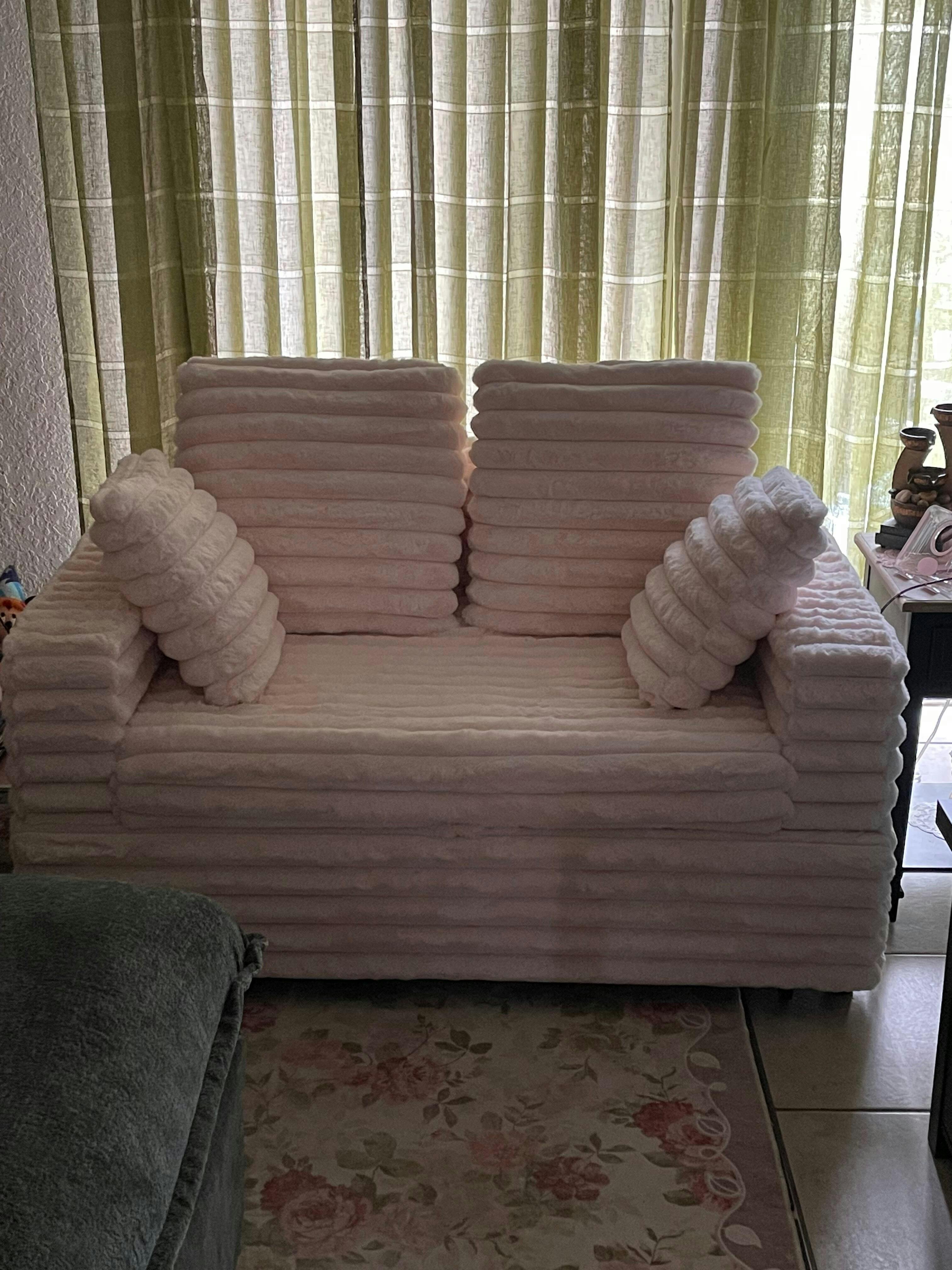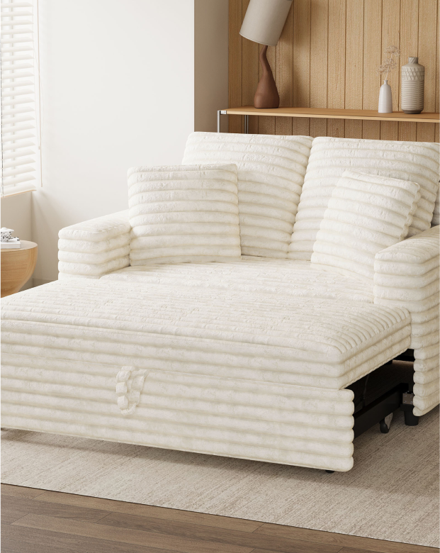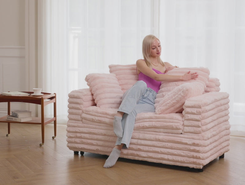 Nido combines cozy textures with versatile function. Wrapped in Faux Rabbit Fur Corduroy, this loveseat easily converts into a bed and comes with a small accent pillow, offering both comfort and practicality in one stylish package.