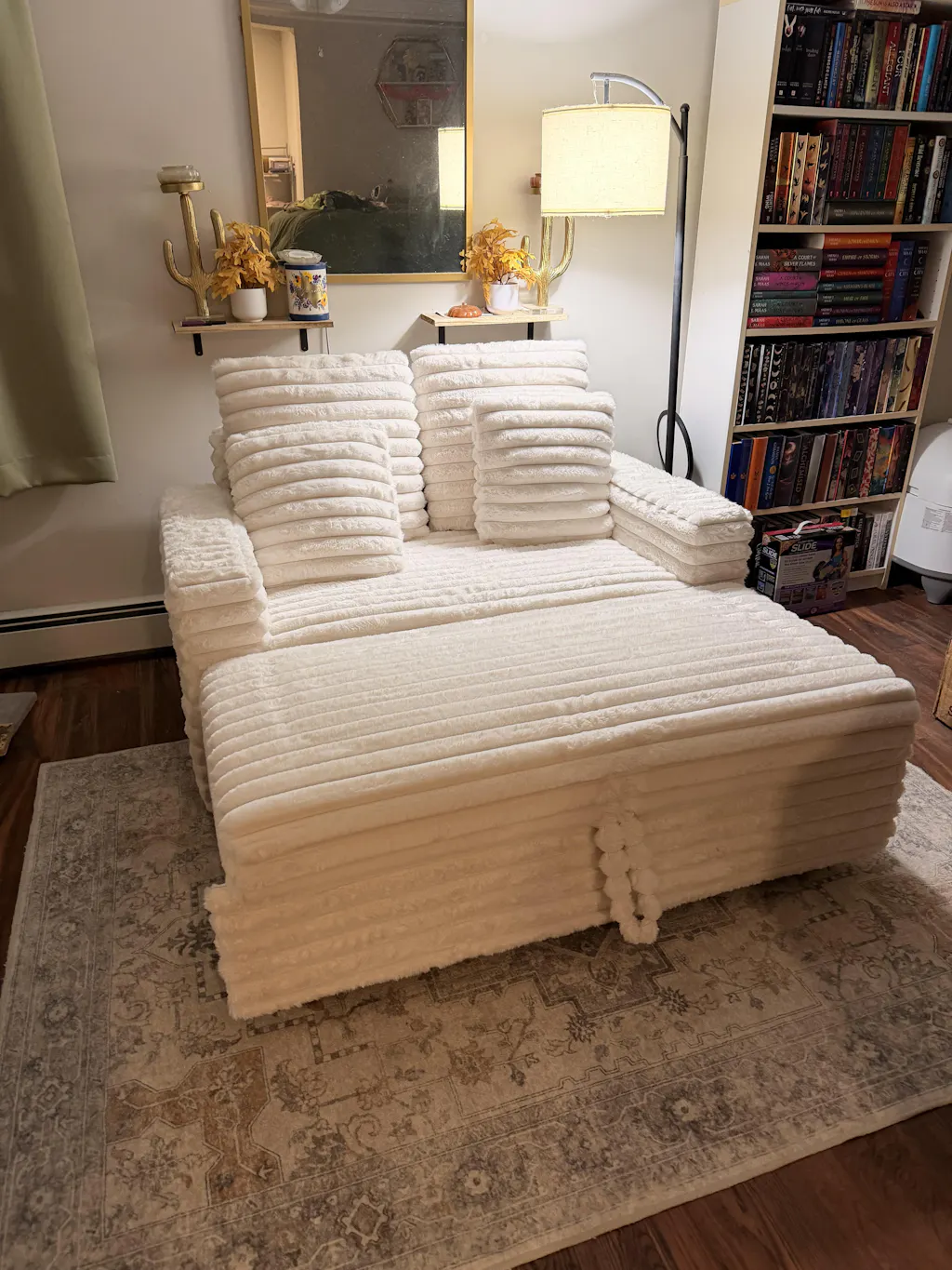 The Nido pull-out sofa perfectly combines comfortable texture with versatility. This two-seater sofa is made of faux rabbit fur corduroy fabric and features large cushions, seamlessly blending comfort and practicality with a stylish design.