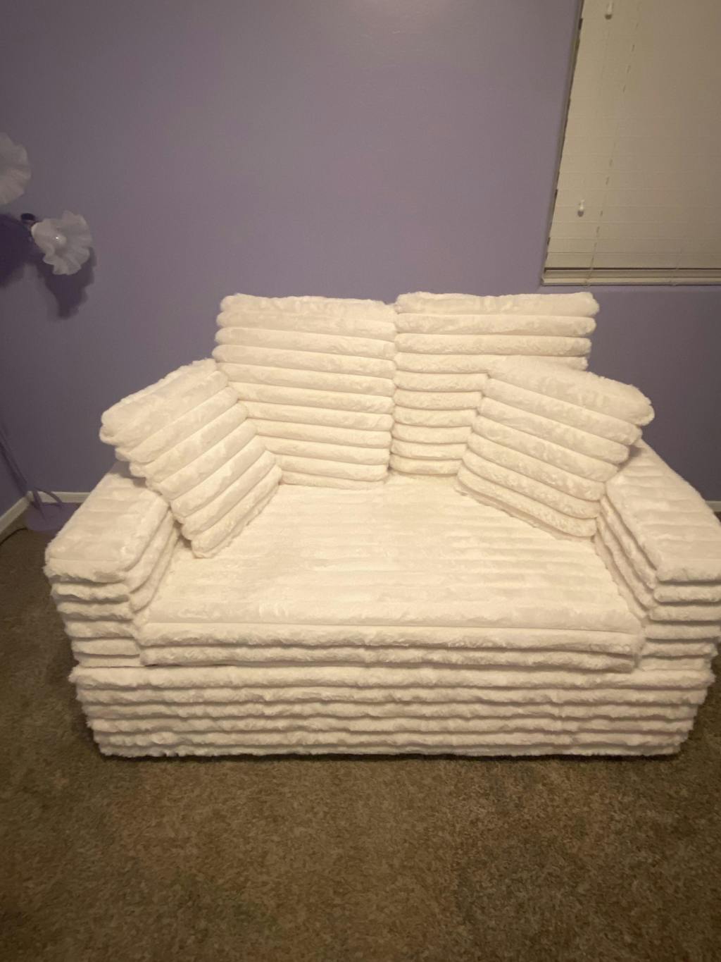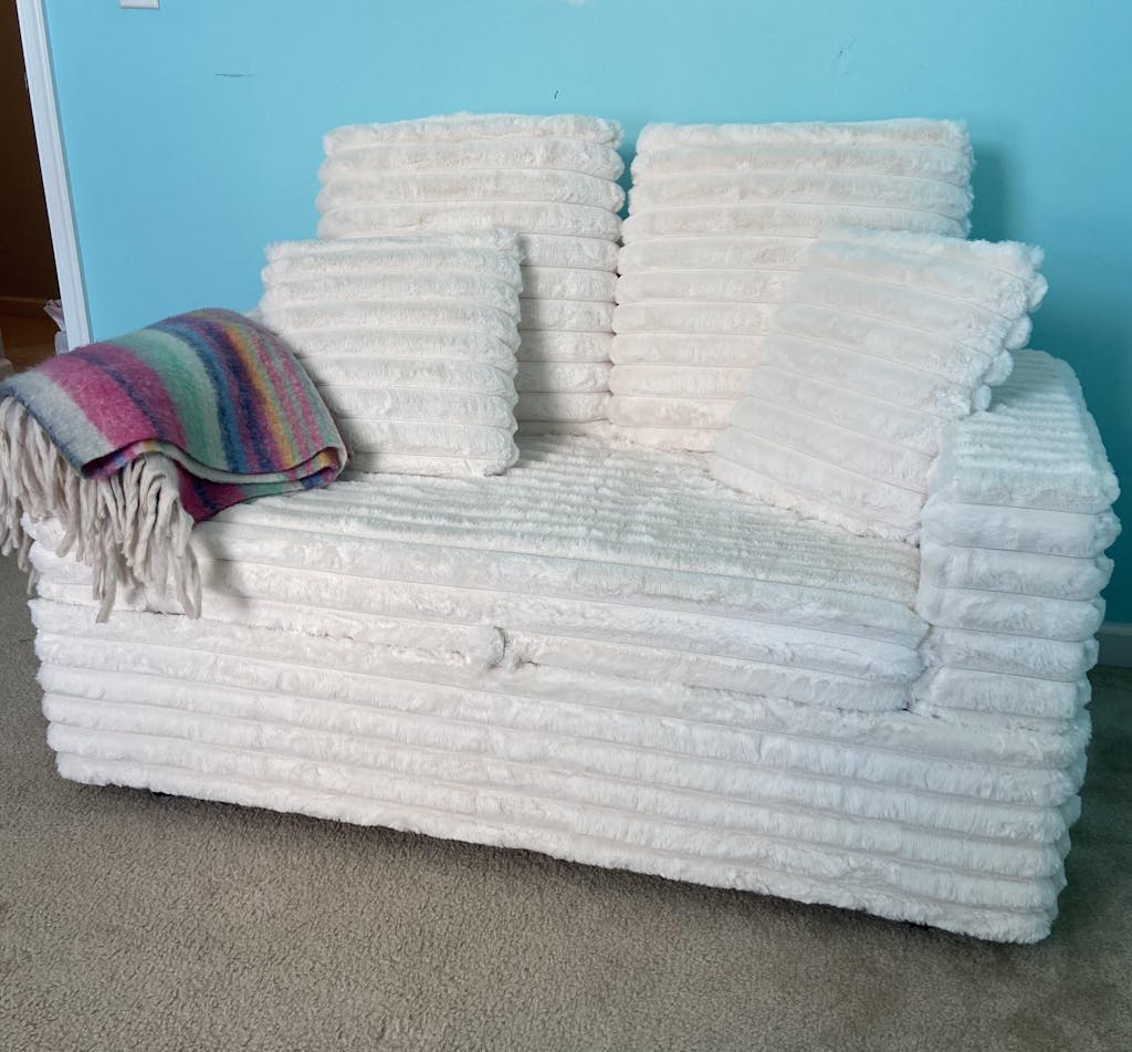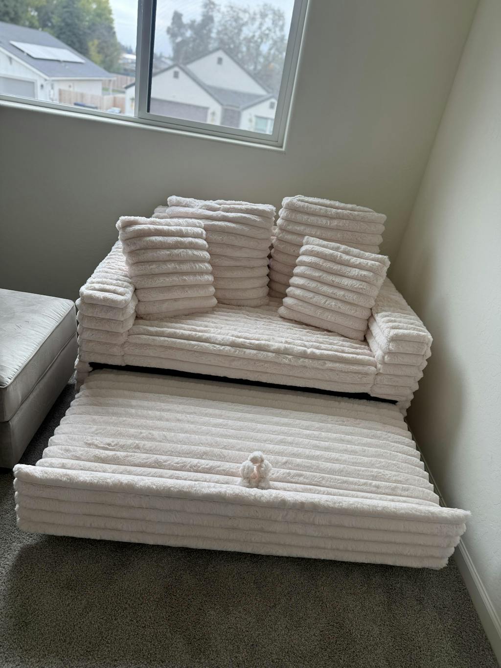 The Nido pull-out sofa perfectly combines comfortable texture with versatility. This two-seater sofa is made of faux rabbit fur corduroy fabric and features large cushions, seamlessly blending comfort and practicality with a stylish design.