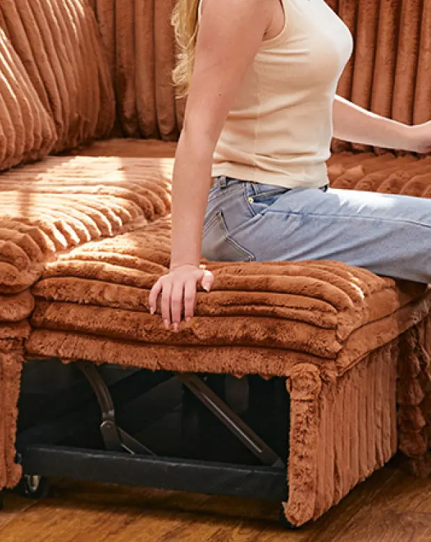 Plume exudes luxury with its plush textures and seamless design. Wrapped in Faux Rabbit Fur Corduroy that mimics the softness of rabbit fur, and featuring an integrated chaise, it offers a refined and cozy seating experience that elevates any living space.